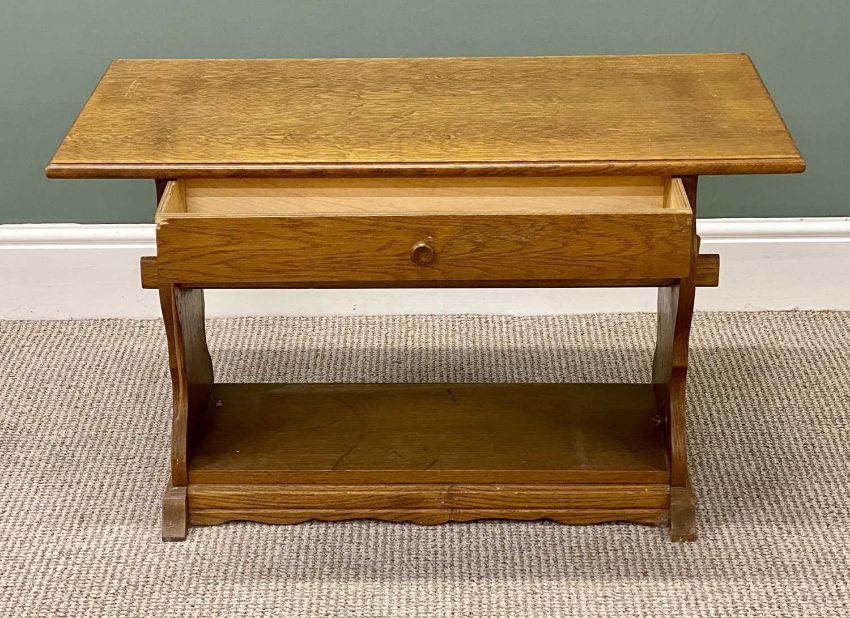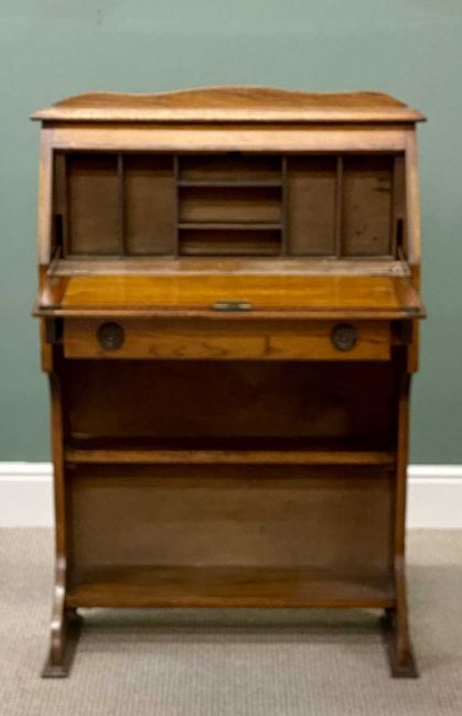 20TH CENTURY OAK FURNITURE, comprising compact bureau with drop-down front, single drawer and two base shelves, 112 (h) x 75 (w) x 34cms (d); and a small oblong topped table with single drawer, 52 (h) x 87 (w) x 45cms (d) (2)Provenance: deceased estate Ynys Môn