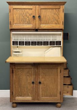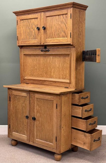 VINTAGE OAK QUICKSEY KITCHENETTE CABINET with fitted interior, associated utensils including glasses and pull-outs, etc. (2 piece), 199 (h) x 107 (w) x 57cms (d)Provenance: private collection Conwy