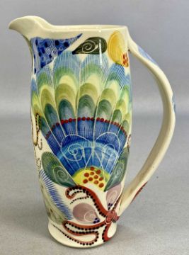 20TH CENTURY CERAMICS, Pru Green Gwili cream glazed jug with colourful shell and mollusc design, 24.5cms (h); Rosenthal Studio line 'Flash' pattern bowl, 14cms (w); and a Wedgwood green majolica grape and vine leaf jug, 13cms (h)Provenance: private collection Gwynedd
