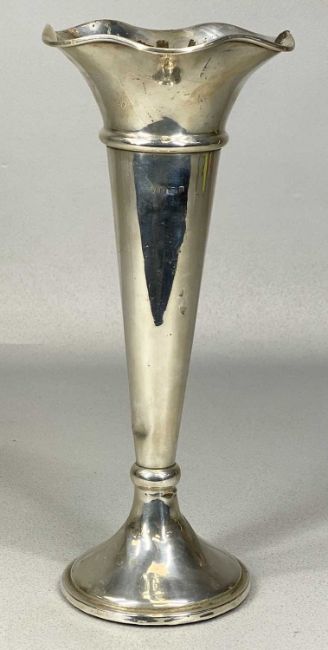 GEORGE V SILVER TRUMPET-FORM VASE, circular loaded base, Edward Barnard & Sons, Birmingham 1919, 26.5cms (h), 12.5ozt gross (includes weighted base)Provenance: deceased estate Conwy