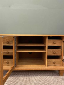 MODERN 'ANDRENA' LIGHT OAK LOW CUPBOARD, with glazed central door and two side doors, British Made, 65 (h) x 107 (w) x 53cms (d)Provenance: private collection Conwy