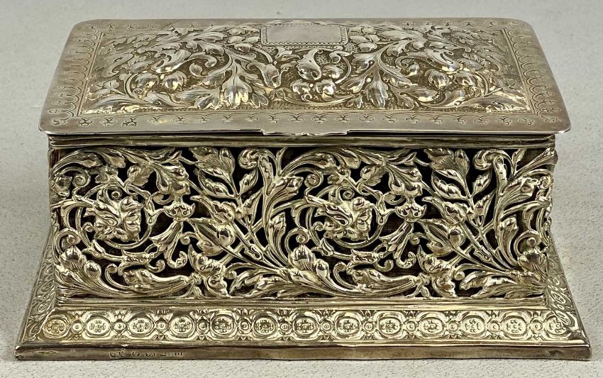 VICTORIAN SILVER TRINKET BOX, domed lid, highly detailed repoussé and pierced designs, blue silk-lined interior, Samuel Walton Smith, date mark obscure, 8 (h) x 17 (w) x 12cms (d), approx. 12ozt grossProvenance: private collection Denbighshire