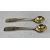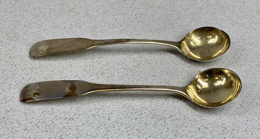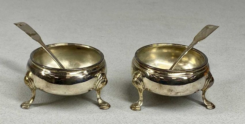 TWO GEORGIAN CIRCULAR SILVER OPEN SALTS, on hoof feet, hallmarks rubbed, 6cms (diam.); a Georgian silver mustard spoon, 3ozt gross; and a pair of spoonsProvenance: private collection Gwynedd