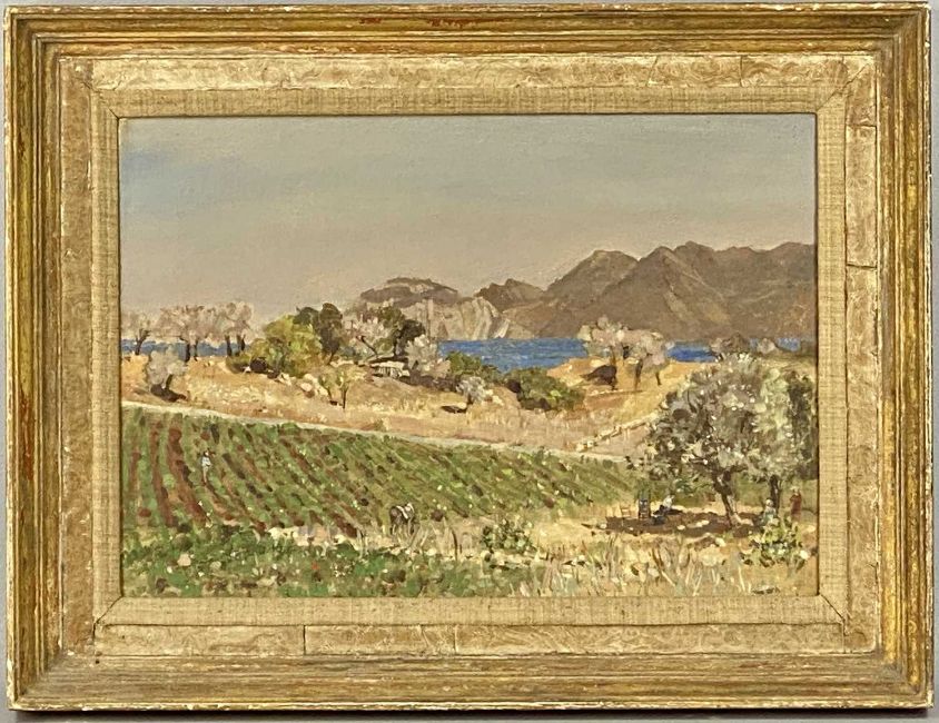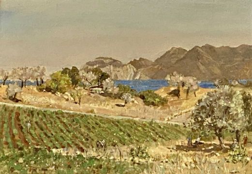 ‡ AELRED BARTLETT (British, 1918-2004) oil on canvas - entitled verso 'Landscape in Greece', unsigned, label verso 'Published from Reid Gallery, Guilford, 26.12.68', 31.5 x 46cmsAuctioneer's Note: Bartlett was a painter, architectural decorator, and stage set designer. His major work was the completion of the marble revetment in Westminster Cathedral to the original designs prepared by J.F. Bentley in the 1890s, which had previously gone unexecuted due to lack of money.Provenance: private collection GwyneddComments: framed