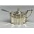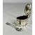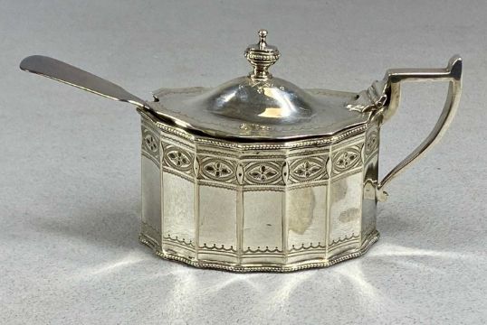 VICTORIAN SILVER MUSTARD POT, of panelled oval form, with hinged cover, blue glass liner, and spoon, London 1881, 4.5oztProvenance: private collection Gwynedd