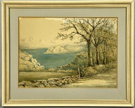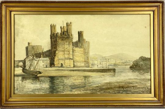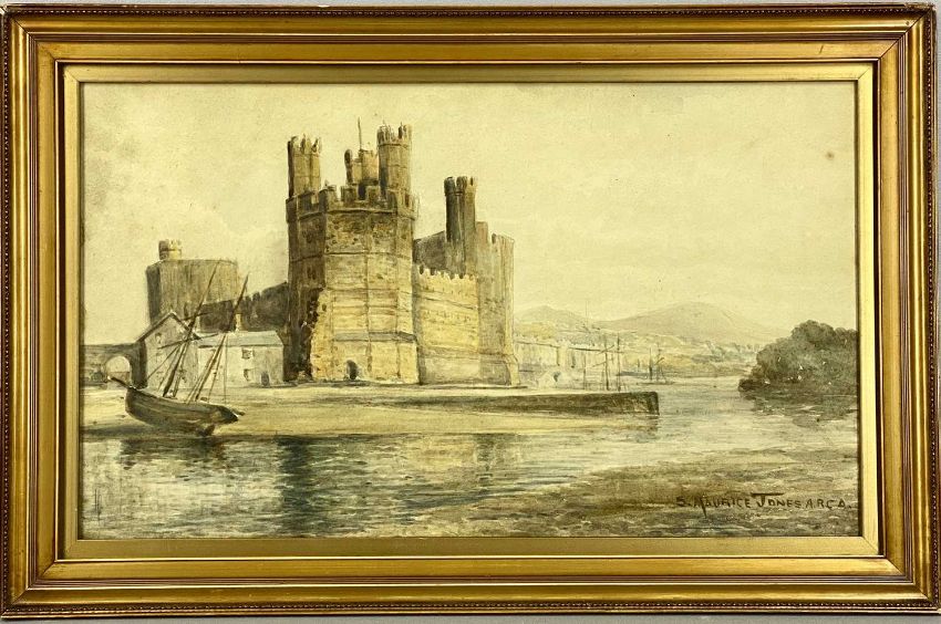 SAMUEL MAURICE JONES (Welsh, 1853-1932) two watercolours - Caernarfon Castle, 29 x 50cms, and coastal view with trees to side, 25 x 35cms, both signed lower right (2)Provenance: private collection GwyneddComments: both framed and glazed