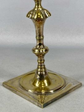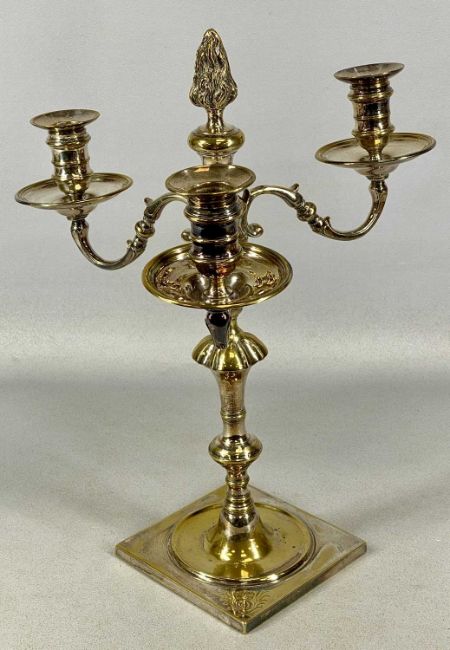EPNS THREE-BRANCH CANDELABRA with removable nozzles, central flame finial, 44cms (h)Provenance: private collection Gwynedd