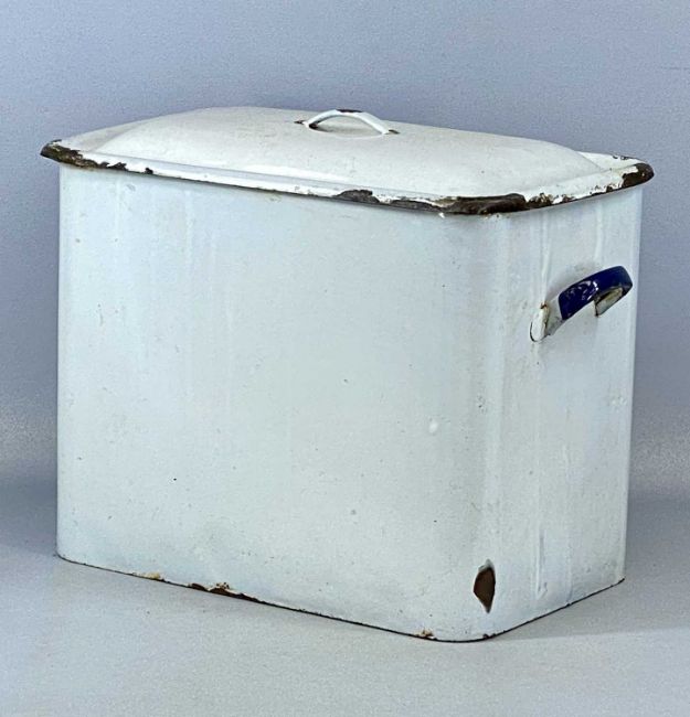 LARGE VINTAGE ENAMEL BREAD BIN, white with black lettering and blue handles, 34 (h) x 43 (w) x 28cms (d)Provenance: private collection Conwy