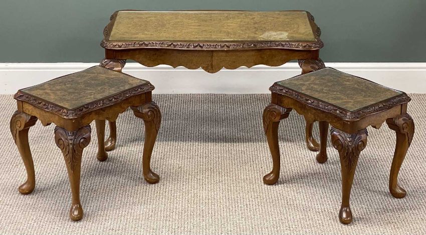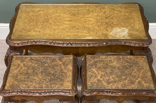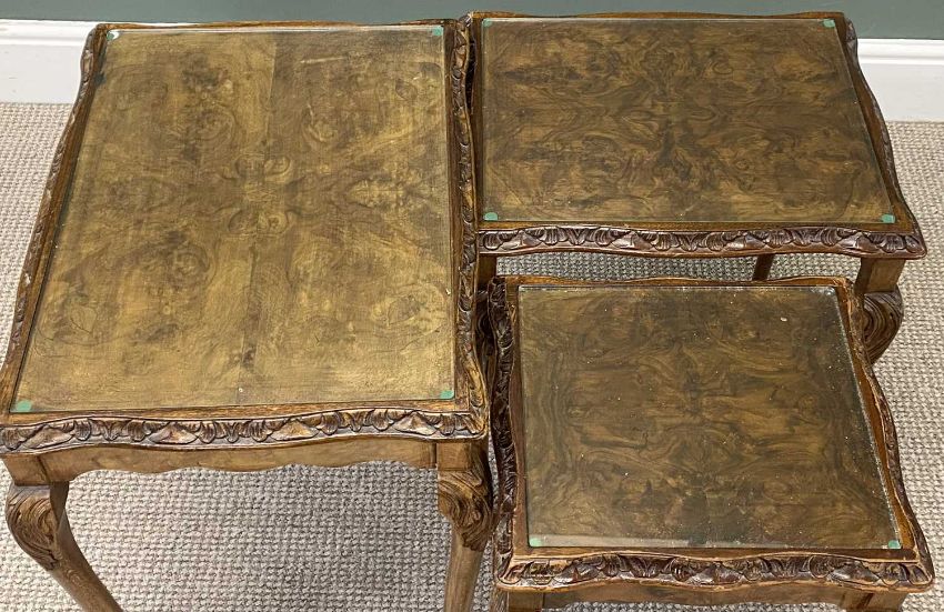 TWO WALNUT NESTS OF THREE TABLES, 49 (h) x 94 (w) x 49cms (d), and 56 (h) x 53 (w) x 51cms (d) (2)Provenance: private collection Conwy