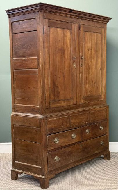 ANTIQUE YEW PRESS CUPBOARD, two doors over two short and one long drawer, 195 (h) x 143 (w) x 54cms (d)Provenance: private collection Conwy