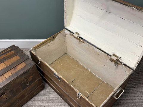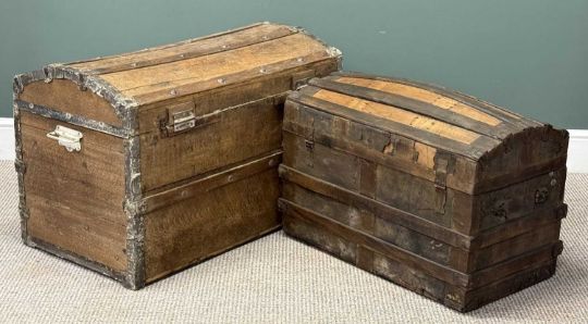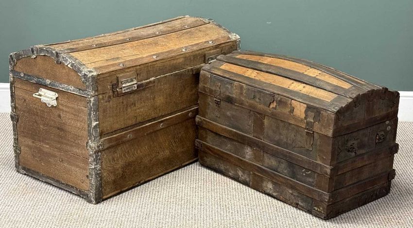 TWO VINTAGE WOODEN DOME-TOP TRUNKS, 59 (h) x 92 (w) x 51cms (d); and 50 (h) x 72 (w) x 41cms (d)Provenance: private collection Conwy