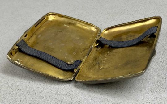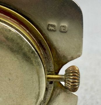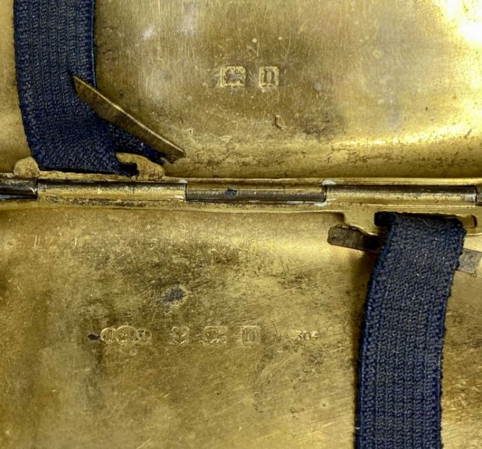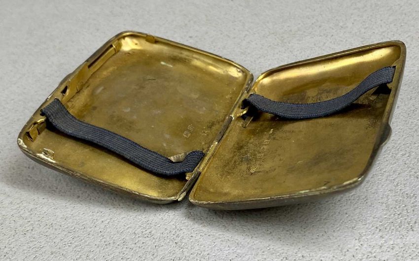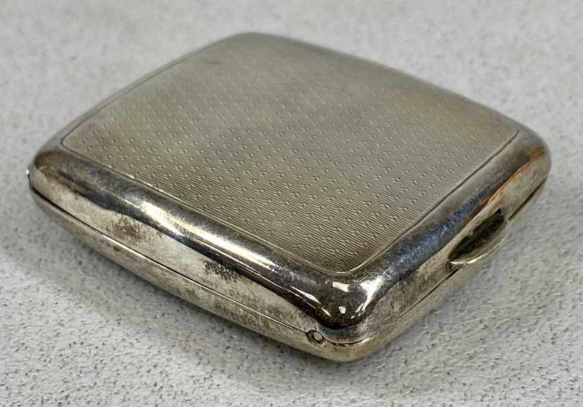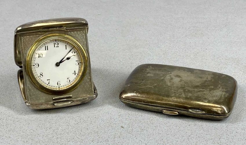 SILVER COLLECTABLES, to include George V silver travel clock of square form, engine turned decoration to the case, manual wind clock with white enamel dial and black Arabic numerals, blue steel hands, Robinson & Co., Birmingham 1918, 6.5 x 5.5cms; and George V silver cigarette case of plain form, Joseph Gloster, Birmingham 1912, 8 x 6cmsProvenance: private collection Gwynedd
