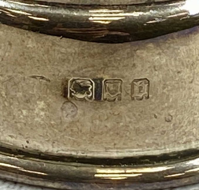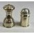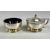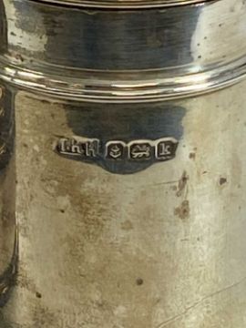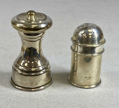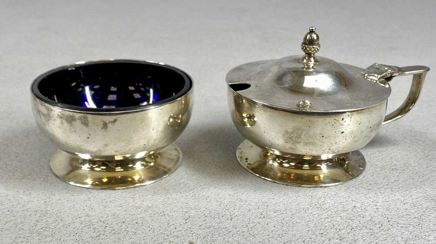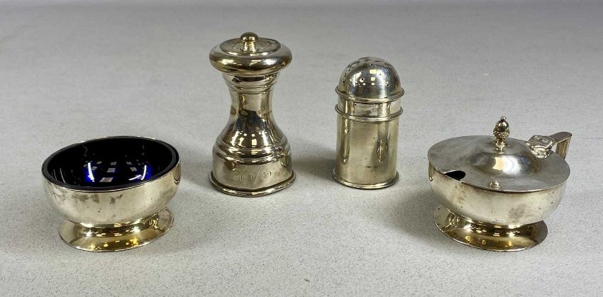 ELIZABETH II CIRCULAR SILVER MUSTARD POT & MATCHING OPEN SALT, each having blue glass liners, John Charles Lowe, London 1955; Edward VII silver pepperette with domed lid, Birmingham 1909, 7cms (h); and a George V silver pepper grinder, Birmingham 1917, 9cms (h), 7ozt gross excluding liners and grinderProvenance: private collection Gwynedd