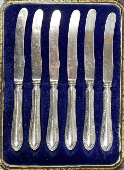 CASED CUTLERY, pie server with silver handle, cheese knife and butter knife with silver handles, six silver-handled dessert knives, and a pair of plated berry spoonsProvenance: private collection Conwy