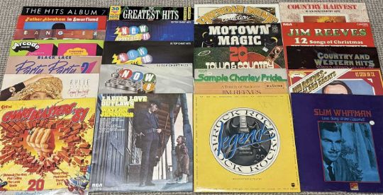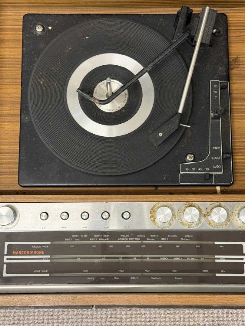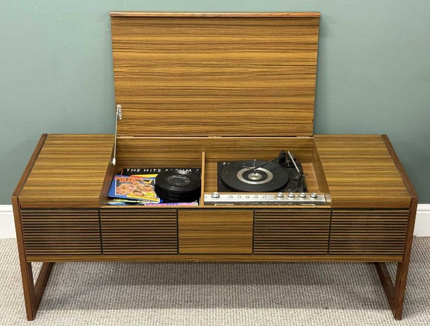 VINTAGE RADIOGRAM CABINET BY MARCONI, model no. 4353, 52 (h) x 136 (w) x 90cms (d); and a quantity of vinyl recordsProvenance: deceased estate Ynys Môn