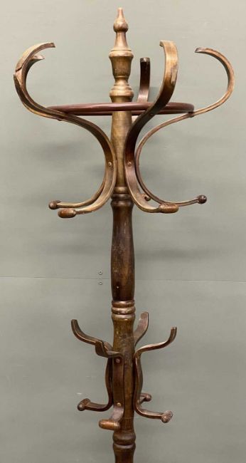 BENTWOOD TYPE HAT / COAT STAND, with tripod base, multiple hooks, 186cms (h); Edwardian stained spindle-back quirky elbow chair; and a carved treen cat ornament, 63cms (h) (3)Provenance: deceased estate Gwynedd