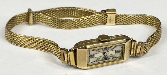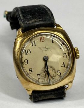 WALTHAM VINTAGE 9CT GOLD CUSHION CASED GENT'S WRISTWATCH, 29mms, monogrammed on back and dated 7.2.40; and a vintage ladies' 9ct gold wristwatch, rectangular case, 24 x 11mms, on plated bracelet (2)Provenance: private collection Denbighshire
