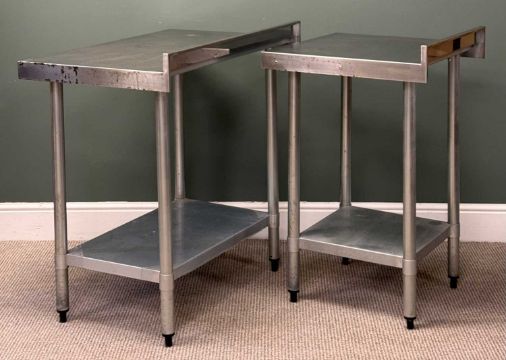 CATERING PREP TABLES, two steel with rail backs, 96.5 (h) x 90 (w) x 60cms (d) and 96.5 (h) x 60 (w) x 60cms (d); together with a wooden-top and chrome-legged bar type table, 103.5 (h) x 60cms (diam.)Provenance: private collection Conwy