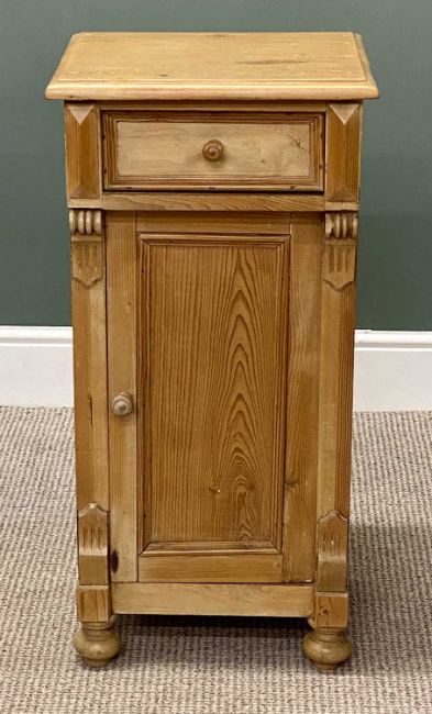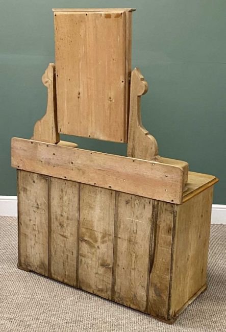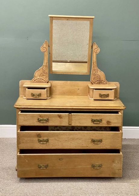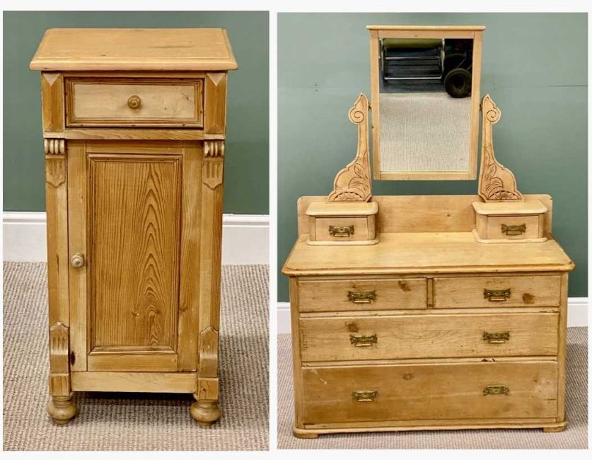 VINTAGE PINE DRESSING CHEST OF DRAWERS, with a swing-top mirror having two small drawers, 150 (h) x 70 (w) x 52cms (d); and a similar style bedside cupboard with single drawer and door, 85 (h) x 42 (w) x 38cms (d) (2)Provenance: private collection Gwynedd