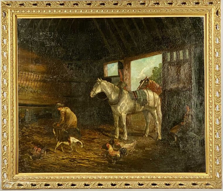 UNKNOWN 19TH CENTURY oil on canvas - stable interior with grey horse, figure, hound, and chickens, unsigned, 62 x 75cmsProvenance: private collection GwyneddComments: framed and glazed