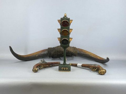 COLLECTABLES, to include pair of vintage buffalo horns, 90cms span; and tinplate bar top traffic lights 'Bar is Closed', 'Last Call', and 'Bar is Open', 51cms (h)Provenance: deceased estate Ynys Môn