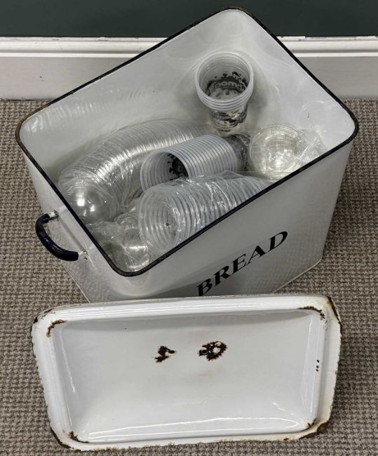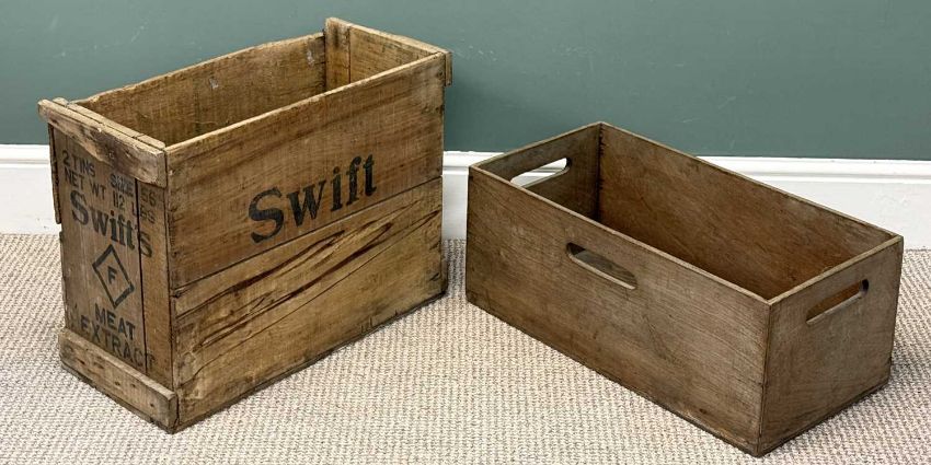 GOOD VINTAGE ENAMEL LIDDED BREAD BIN, 48 (h) x 41 (w) x 29cms (d); and two old produce crates, one labelled 'Swift'Provenance: private collection Conwy