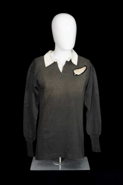 RUGBY UNION CLUB HOUSE: 1954 NEW ZEALAND ALL BLACKS JERSEY MATCH-WORN BY PROP KEVIN SKINNER (1927-2014) AGAINST SCOTLAND AT MURRAYFIELD, swapped with opposite number Hugh McLeod of Scotland, Canterbury jersey with embroidered silver fern logo on left breast, one button (missing) to white collar, white No. 15 to the rear, which corresponds to the loose head position occupied by Kevin Skinner on the 1953-54 tour to the UK, Ireland and France. The game was played at Murrayfield on 13 February 1954 and won 3-0 by the All Blacks thanks to a penalty from Bob Scott.Kevin Skinner made his All Black debut as a 21-year old prop forward in 1949. By 1952 he was good enough to be made captain of his country when the All Blacks retained the Bledisloe Cup against Australia. When he retired at the end of the 1953-54 All Blacks tour he was one of the stars of the team. On the tour he played in 27 of the 36 games and first came up against Hugh McLeod at Galashiels in the night game of the tour against South of Scotland. On that occasion the All Blacks ran riot, scoring seven tries in a 32-0 victory. The international clash with Scotland was a much tighter affair, with that single Bob Scott penalty earning the tourists a third win in four internationals in the UK and Ireland. A former heavyweight amateur boxing champion of New Zealand in 1947, he was a tough nut in the front row and never afraid to use his fists to solve any problem on the field. After the tour he stepped back from rugby to concentrate on farming and looking after his daughter, who was deaf. But when the Springboks arrived in 1956, and their giant pack began to take liberties with the All Blacks front row, the New Zealand selectors put out an SOS to Skinner. He returned to action in the third and fourth Tests and laid down the law. He played in 20 Tests for the All Blacks, captaining them twice, and in 63 matches in total – a record at the time. He was inducted into the New Zealand Sports Hall of Fame in 1996 and died in 2014 at the age of 86.Provenance: Hawick Rugby Football ClubComments: three small pin holes, some light fading