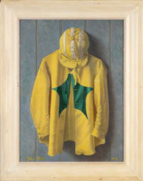 HORSERACING CLUB HOUSE: JOHN FLINT (20th C.) oil on board - 'Racing Colours', green & yellow racing silks hanging on a peg, signed and dated 1978, titled verso on Pictures For Schools label, 36.5 x 27cmsProvenance: private collection GlamorganComments: small paint chip overpainted.