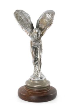 MOTORING CLUB HOUSE: ROLLS ROYCE 'SPIRIT OF ECSTASY' CAR MASCOT, on nickel mount and turned wood base, 19.5cms (h) overallProvenance: private collection CardiffComments: worn, inspection advised.