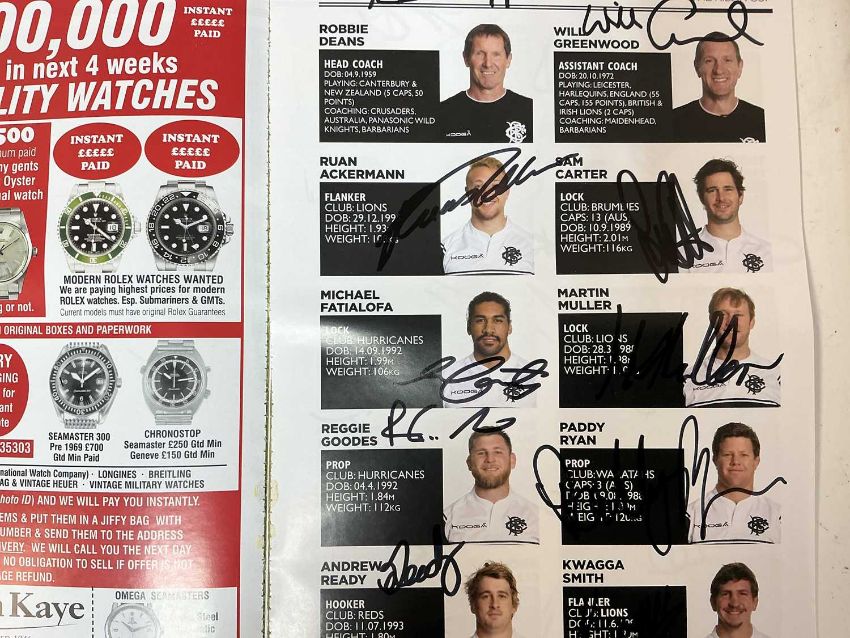 RUGBY UNION CLUB HOUSE: COLLECTION OF BARBARIANS PROGRAMMES, between 2009-2024, including signed Barbarian programmes from New Zealand 2009, South Africa 2010, England 2011, Australia 2011, England 2014, Australia 2014, Samoa 2015, South Africa 2016, England 2017, England 2018, England 2019, Fiji 2019, All Blacks XV 2022, and British & Irish Lions Hong Kong 2013, together with all other programmes where Wayne Mortimer was affiliated with the Barbarians, with a copy of 50th Jubilee 1937 - 1987 souvenir publication. (Qty)Provenance: The collection of Wayne Mortimer. Mortimer had a long and distinguished career as a sports masseur, working with some of the best players and coaches of the modern era. He began at Cardiff RFC in 1993 and, in 2008, was invited by Dai Young to tour with the Barbarians, where the team played in Belgium, Ireland, and England. He remained with the Barbarians from that point onward, travelling the world with the team. They played the British & Irish Lions in Hong Kong in 2013 (with Dai Young as coach), Brazil in São Paulo in 2019 (coached by Eddie Jones), and Wales in Cardiff (coached by Warren Gatland). Over the years, he also worked alongside renowned coaches including Sir Graham Henry, Sir John Kirwan, Dai Young, Warren Gatland, Fabien Galthié, Michael Cheika, and Jamie Joseph. He also worked with many world-class players, such as Charles Ollivon, Damien Penaud, Keven Mealamu, Bismarck du Plessis, Jean de Villiers, Ardie Savea, and Justin Tipuric.Mortimer completed his 16-year tenure with the Barbarians in 2024.