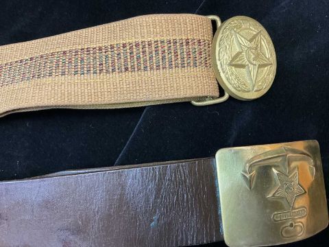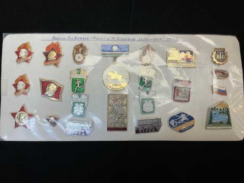 MILITARY CLUB HOUSE: RUSSIAN MILITARY INTEREST, Russian Armed Forces garrison hat 'Pilotka', inner Russian maker's mark and No. 58 printed in ink; Russian Army Officer's parade belt, on canvas webbing, with brass five-pointed star emblem; brown Russian Navy Officer's belt, with star and anchor emblem; Soviet Military Officer's parade cap, with red star insignia; Russian Ushanka fur hat, with inner label 'USSR', size M (reproduction); two Soviet cap badges (restrikes); black 'NVA' German Officer's winter hat, size L, cotton and polyester (reproduction); collection of 23 Russian pin badges; and Chernobyl Liquidator's badge (awarded to personnel who participated in the cleanup of Chernobyl nuclear disaster, 1986) (qty)Provenance: private collection CardiffComments: inspection advised, restrikes, reproductions