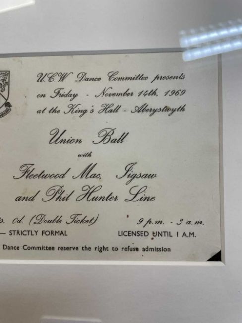 AUTOGRAPH & EPHEMERA CLUB HOUSE: FLEETWOOD MAC SIGNED CONCERT TICKET, for the band appearing at the Union Hall, King's Hall University College Wales, Aberystwyth on Friday 14th November 1969, the reverse of the ticket signed in red pen by band members Peter Green, Mick Fleetwood, John McVie, Jeremy Spencer, and Danny Kirwan, 11.5 x 15cmsProvenance: private collection CeredigionAuctioneer's note: At the time of the concert, Fleetwood Mac were No. 3 in the popular music charts with 'Oh Well' from the album Then Play On, this was part of the 1969 UK tour.Comments: framed and glazed