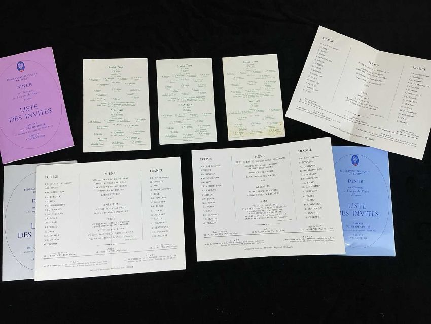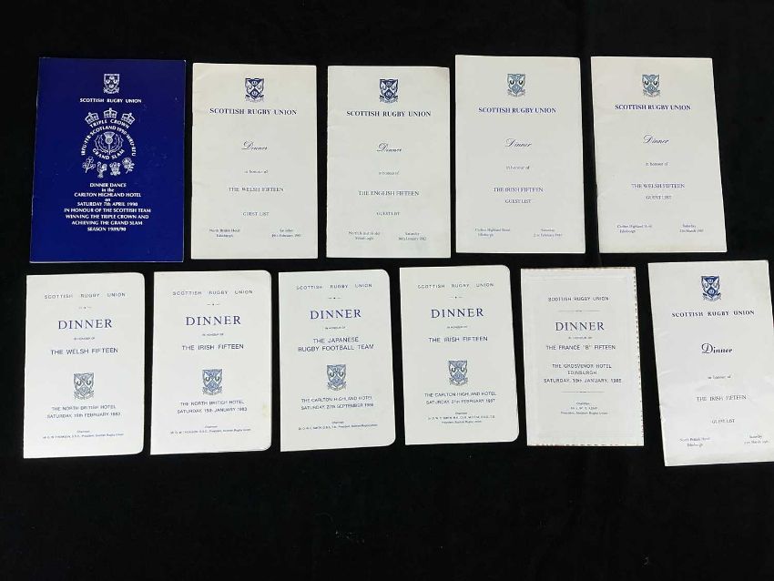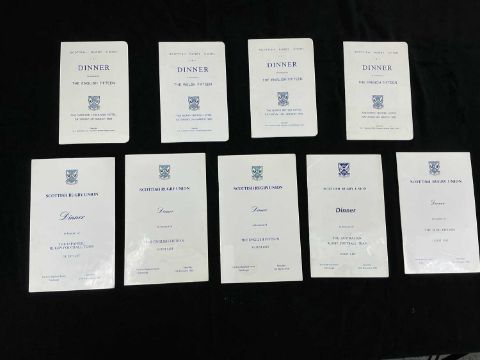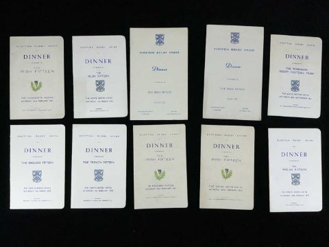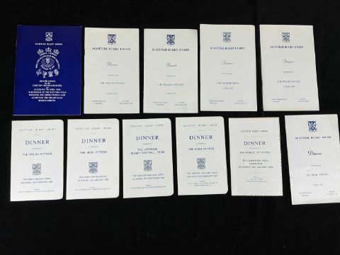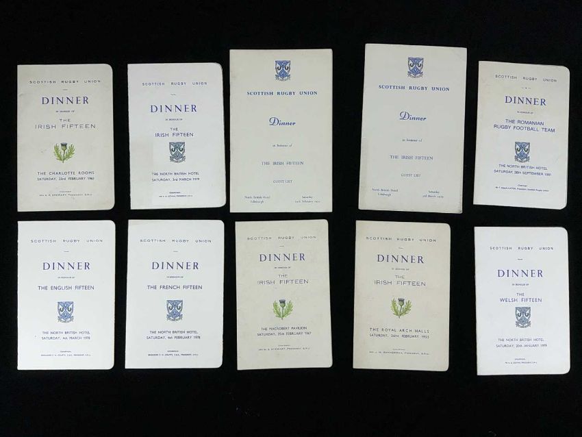 RUGBY UNION CLUB HOUSE: INTERNATIONAL RUGBY CLUB MEMORABILIA, to include dinner menus, guest lists, and ephemera relating to Mr. R.G. Charters, who represented Hawick RFC, the Scottish Rugby Union, and the British & Irish Lions select committee at dinners and functions throughout his tenure. This is an extensive and unusual collection.Provenance: Hawick Rugby Football ClubComments: numerous images supplied to represent the collection, viewing advised.