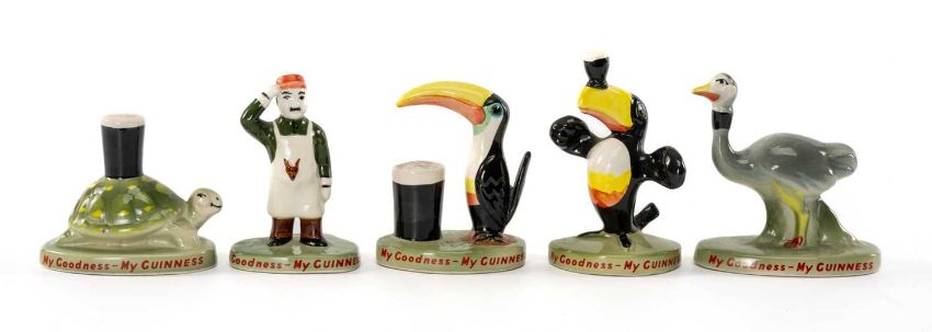 ADVERTISING CLUB HOUSE: FIVE REPRODUCTION GUINNESS-STYLE NOVELTY FIGURINES, on green red-titled bases, comprising emu, two toucans, tortoise, and figure with apron, tallest 11.5cms (h) (5)Provenance: private collection CaerphillyComments: all in good condition