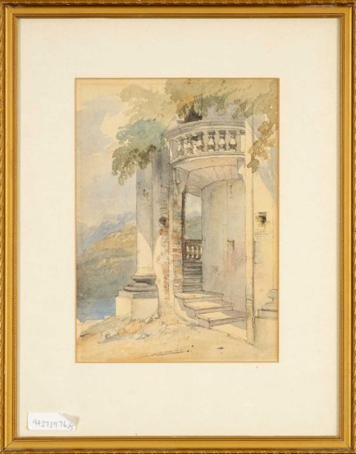 MANNER OF JOHN RUSKIN (British, 1819-1900) watercolour - Mediterranean villa steps and balustrade, 22 x 16cmsProvenance: private collection Flintshire, note verso suggesting the painting was listed as a John Ruskin in an insurance inventoryComments: framed and glazed