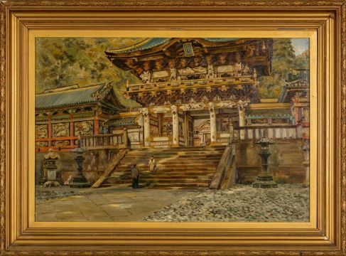 ATTRIBUTED TO ADELA BRETON (British, 1849-1923) oil on canvas - Yomeimo Gate at Nikko, Japan, typed label verso 'Bequest From The Estate of the Artist Adela Breton, December 1923', 49 x 73cmsProvenance: private collection GwentComments: tear lower left, framed, loose in frame, advise reframing.Auctioneer's Note: Adela Catherine Breton was an English archaeological artist and explorer. She made watercolour copies of the wall paintings of Mexican Pre-Columbian temples, notably those of the Upper Temple of Jaguars at Chichen Itza. A collection of her work is held at the Bristol Museum & Art Gallery.