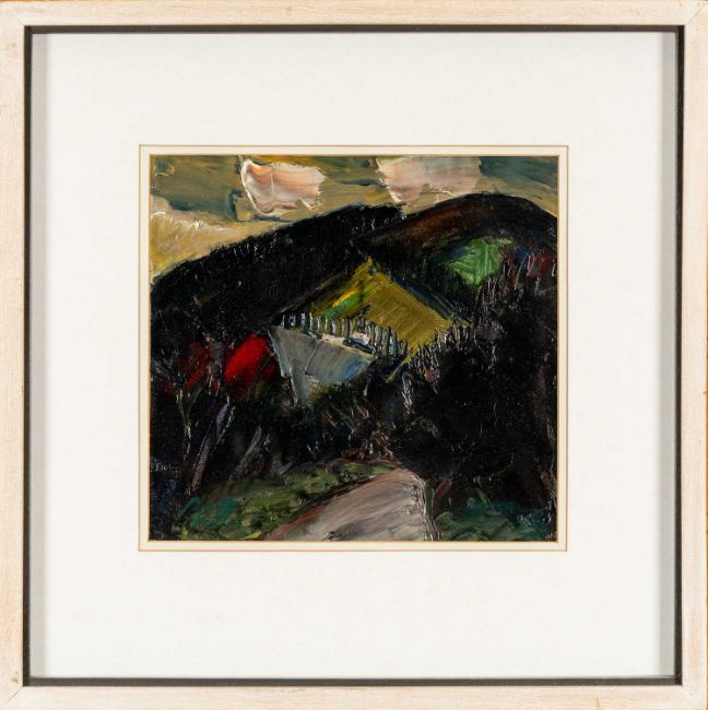 ‡ PETER COLLIS ARHA (Irish, 1929-2012) oil on board - 'Evening Light, Knockree' (Co. Wicklow), signed, titled verso on Fosse Gallery/John Lindsey Fine Art label, 22 x 23cmsProvenance: private collection ConwyAuctioneers Notes: The artist studied at Epsom College of Art before moving to Ireland, where he concentrated on depicting landscapes in the County Wicklow region. A member of the RHA, the artist had a solo exhibition at the Emmet Gallery, Dublin and later also exhibited at Austin Desmond Fine Art, London, The Royal Academy and the Ulster Academy.Comments: framed and glazed