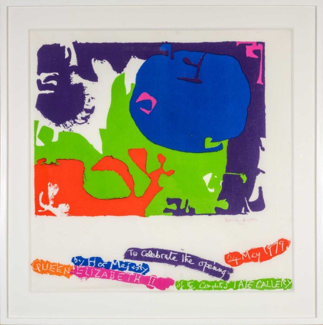 ‡PATRICK HERON (British, 1920-1999) printed silk scarf - abstract design with lettering, 'To celebrate the opening by her Majesty Queen Elizabeth II of the completed Tate Gallery 24 May 1979', manufactured by Alander Mac Intyre, signed in red pen, 88 x 88cmsProvenance: private collection ShropshireComments: framed and glazed, light fold marks, not removed from frame for examination