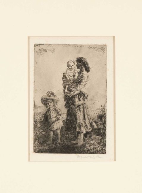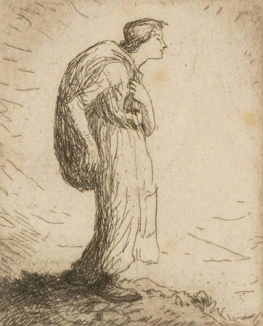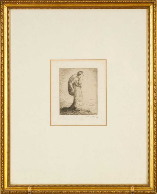 ‡ AUGUSTUS JOHN (Welsh 1878-1961) two dry point etchings and a pencil drawing - etchings entitled, 'Girl with Sack' circa 1906, signed, 10 x 8cms and another 'Out on the Moor' showing a lady with two young children, signed, circa 1906, 15 x 10cms together with a preliminary pencil sketch of a house in ruins, signed, 25 x 41cms (3)Provenance: originally purchased from Sotherby's 'Welsh Sale' Margam Park, October 1999, private collection WiltshireComments: 'Girl with Sack' is framed and glazed with signs of foxing, the other etching is unframed but mounted, the pencil drawing is unframed, has foxing and small tears