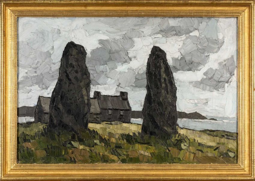 ‡ SIR KYFFIN WILLIAMS RA (Welsh 1918-2006) oil on canvas - landscape at Holy Island, near Porth Dafarch with two Bronze Age monuments and the farmhouse of Plas Meilw, 'Standing Stones at Penrhos Feilw', signed with initials, 60 x 90cmsProvenance: private collection Vale of GlamorganComments: finely framed, glazedFree Home Delivery: free insured delivery to your address available for all lots in Welsh Sale Part I where the invoice is £4000 or more. England and Wales only (excluding Channel Isles and Isle of Wight). Please enquire for further details.