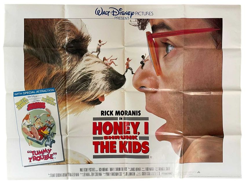 FIVE MODERN FAMILY MOVIE POSTERS The Muppets Christmas Carol (1992), Matinee (1993), Honey I Shrunk the Kids (1989), The Flintstones(1994) and Honey I Blew Up the Kids (1992) all five are original UK cinema film posters, all folded, all standard UK quad size, 30 x 40 inchesProvenance: private collection CardiffComments: unrestored, folded with light line wear, some with pin holes, no rips or tears, all with titles written in pencil on reverse
