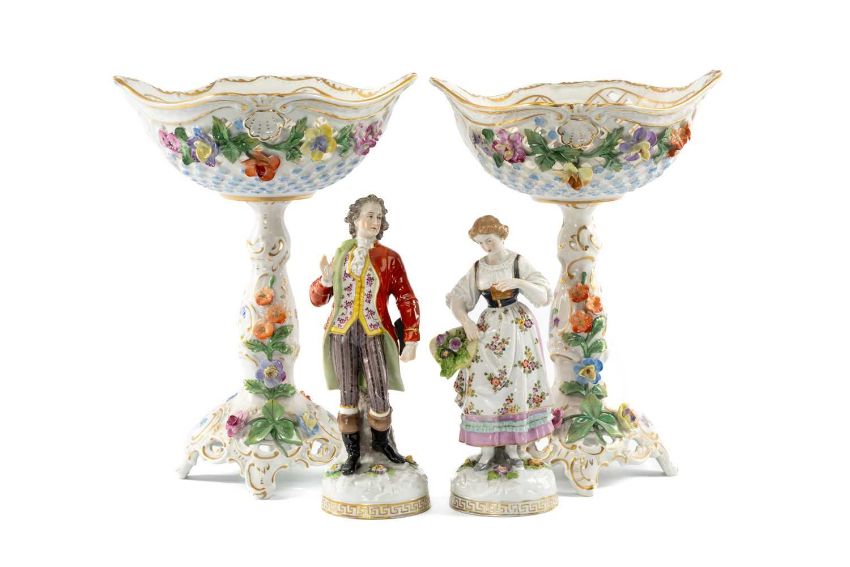 GERMAN PORCELAIN COMPORTS & FIGURINES, two pierced table comports with floral encrusted bases, 31cms (h), pair of Meissen style figurines, 23cms (h) (4)Provenance: private collection NewportComments: tips of fingers damaged, minor chips to petals