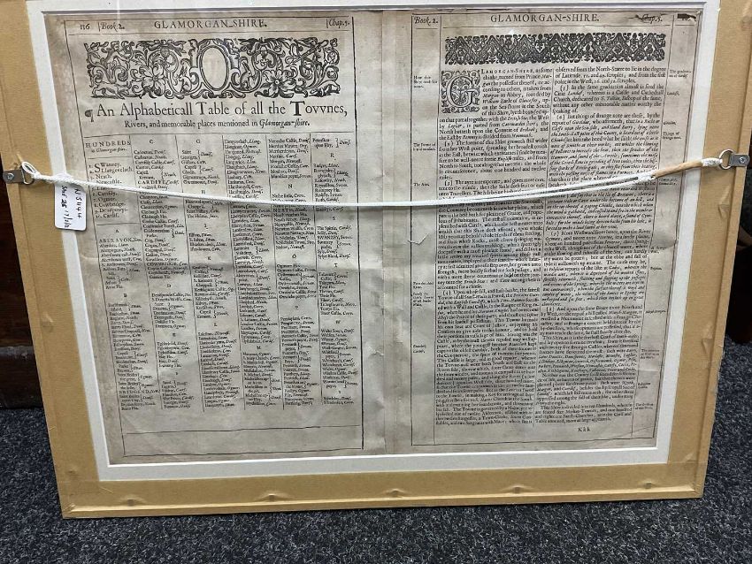 JOHN SPEED coloured antiquarian map of Glamorganshire, double engraved with plans of 'Cardyfe' and 'Landaffe', hand coloured, Sudbury & Humble edition, circa 1610, 39 x 51cmsProvenance: private collection Surreycomments: small tear upper corner and centre, some foxing and loss of colour, framed, glazed