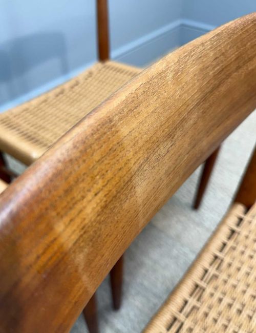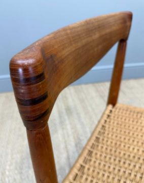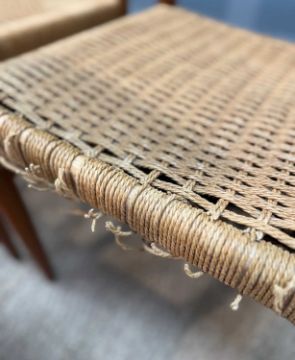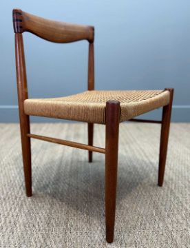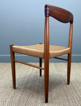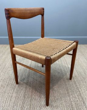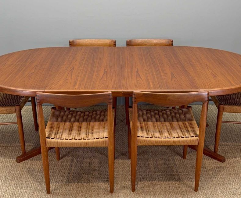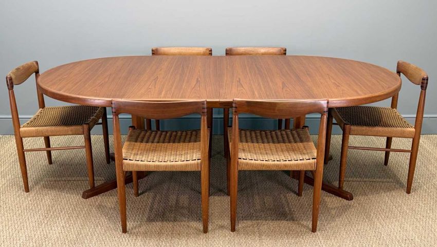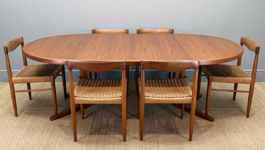 SIX MCM H. W. KLEIN FOR BRAMIN MØBLER TEAK & CORD DINING CHAIRS, together with Svend Aage Madsen for Rosengaarden circular extending teak dining table, 120cms (diam.), with two extensions, both 50cms (7)Provenance: private collection CardiffComments: chair frames appear to be structurally sound, light scratches, stains and signs of use, some loose cord, table very light stains and scratches, consistent colour between table/extensions (stored under protective mats), overall very good+, inspection advised