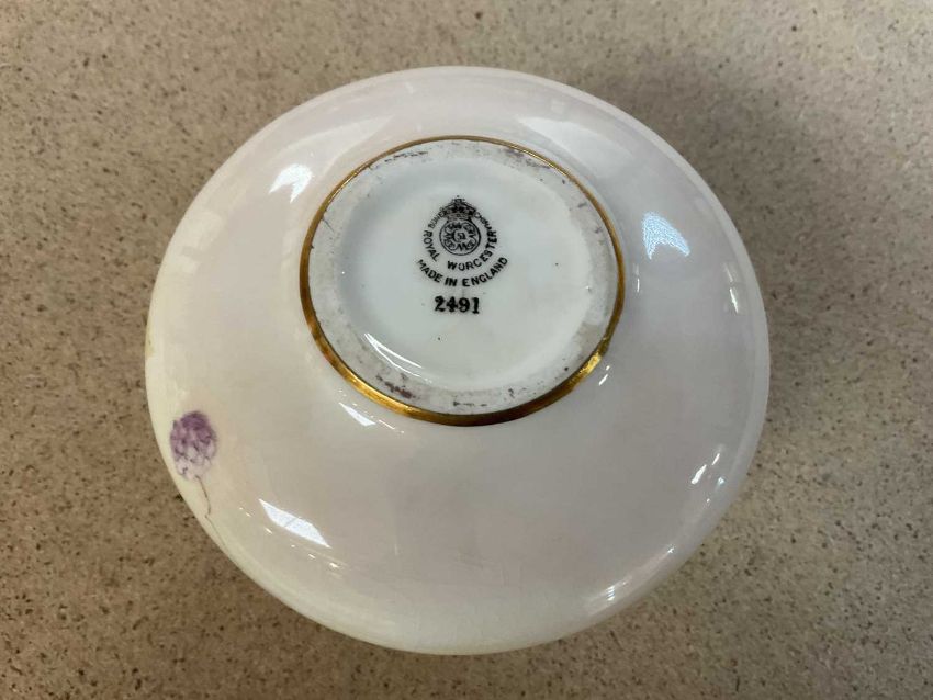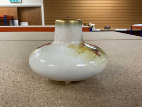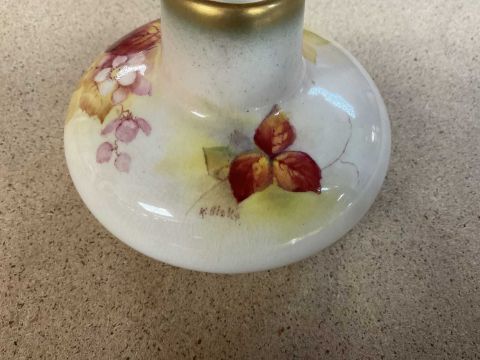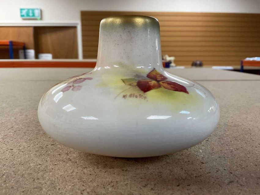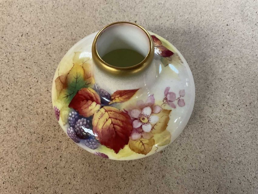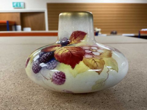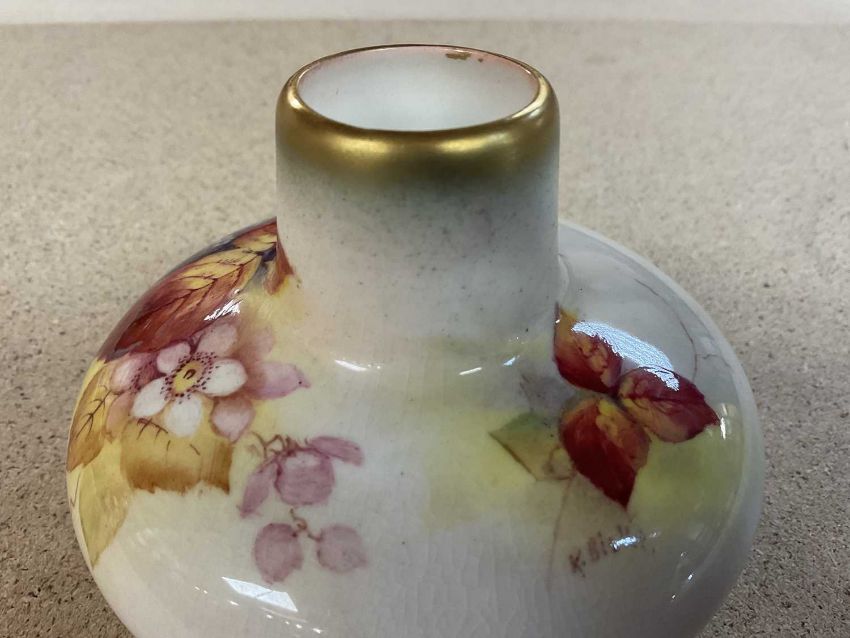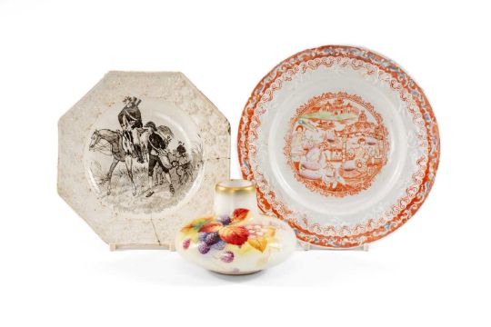 COLLECTABLE CERAMICS comprising Royal Worcester (shape 2491) vase painted by Kitty Blake with autumn blackberries, 7cms (h), Staffordshire Pottery nursery plate printed with mounted huntsman, 15cms (diam.) (damage) and Staffordshire red printed & enamelled chinoiserie saucer dish, 18.5cms (diam.) (rubbed) (3)Provenance: private collection Gwent