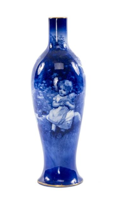 ROYAL DOULTON BLUE CHILDREN WARE VASE of slender form, decorated with a girl and doll, green printed backstamp, impressed no. 1297, 29cms (h)Provenance: private collection Merseyside
