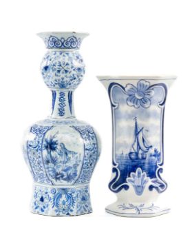 DUTCH DELFT VASE, 18th century, octagonal bottle form with onion bulb neck, panels painted with traditional Dutch scenes and figures, signed 'JV' in blue to base, 33.5cms (h); and a later Dutch Delft panelled vase, 25.5cms (h) (2)Provenance: private collection Cheshire