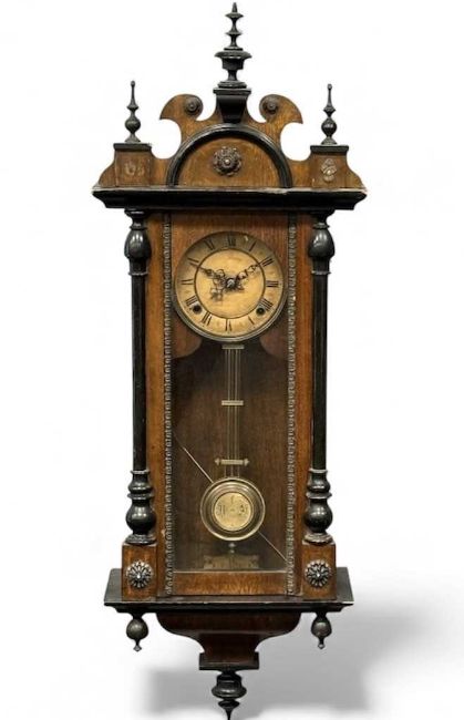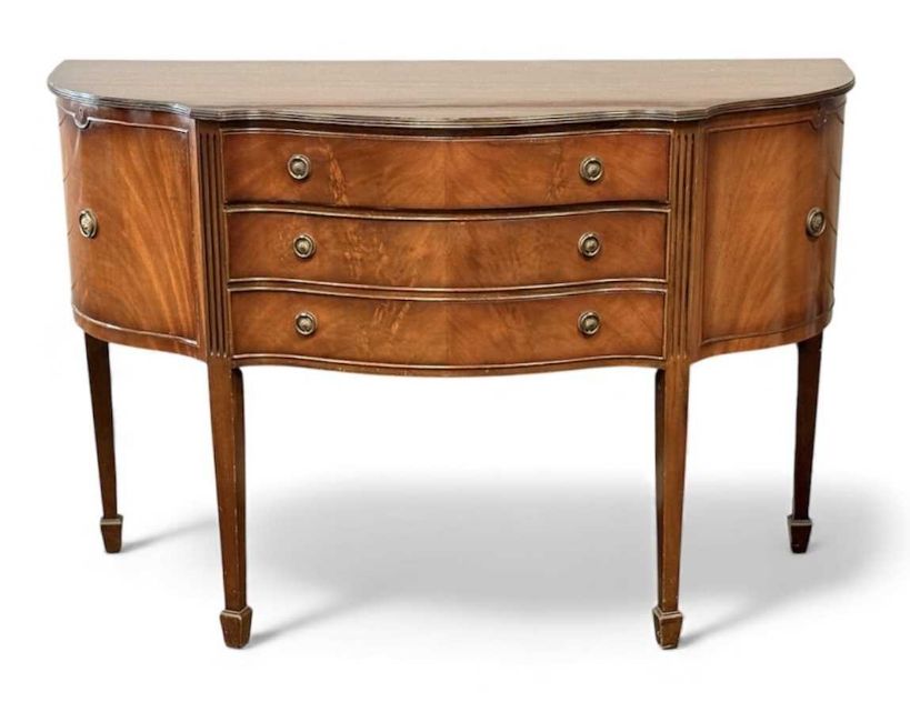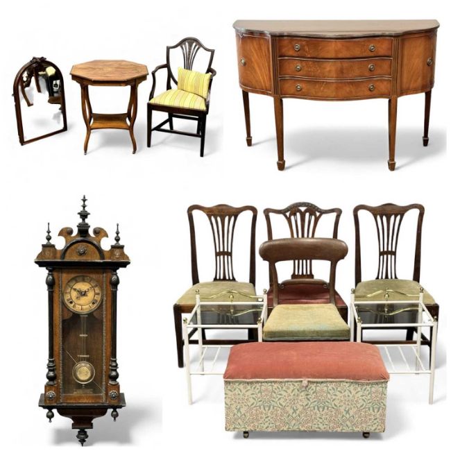 CHARITY LOT IN SUPPORT OF WALES AIR AMBULANCE including assorted antique furnishings, reproduction mahogany serpentine front sideboard and a vintage Vienna style mahogany & ebonised wall clock, 93 (h) x 34 (w) x 16cms (d)Provenance: items generously donated by our vendorsComments: full proceeds to benefit Wales Air Ambulance