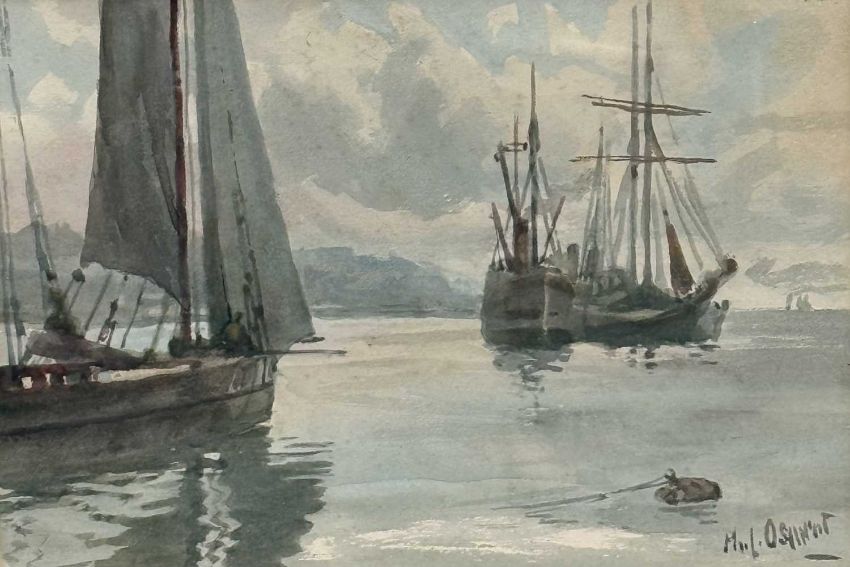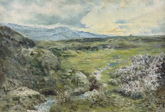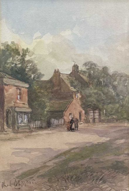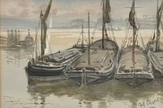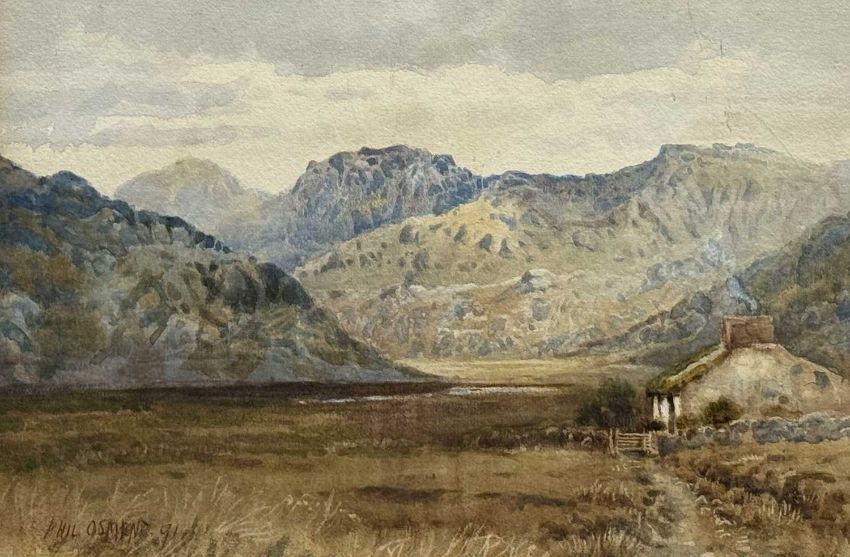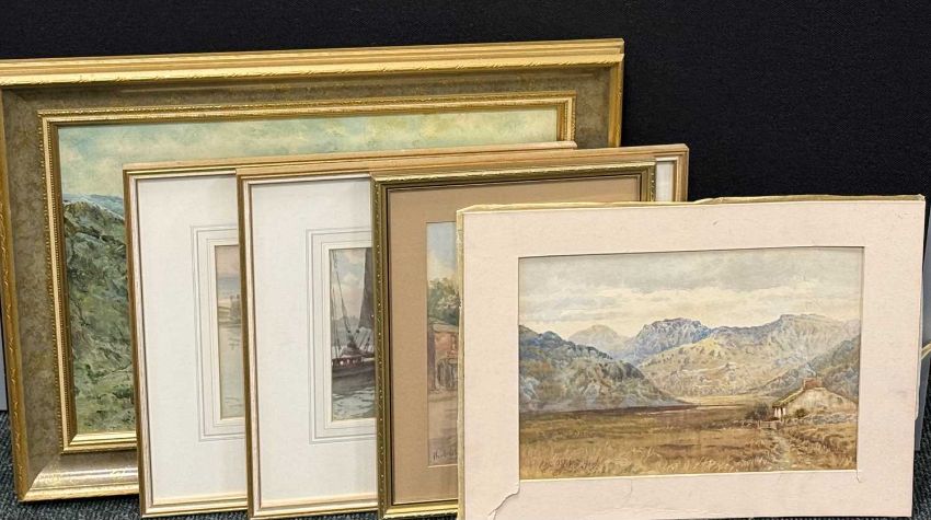 FIVE PHILIP OSMENT (1861-1947) PAINTINGS, oil on canvas board - 'Dartmoor', signed, 35 x 50cms; watercolour - 'Boulogne Harbour', signed, 19 x 27cms; watercolour - 'On the Clyde', signed, 19 x 27cms; watercolour - 'Village Conversation', signed, 26 x 18cms; and watercolour - landscape, 24 x 34cms (unframed) (5)Provenance: private collection Flintshire