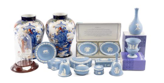 NUMBER OF WEDGWOOD LIGHT BLUE JASPER ORNAMENTAL CERAMICS, together with a pair of Phoenix ware vases (A/F), and a Northumbrian glass sculpture of an oil rigProvenance: deceased estate Wirral